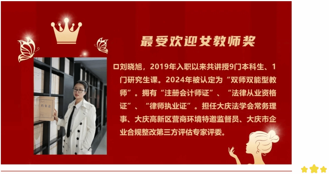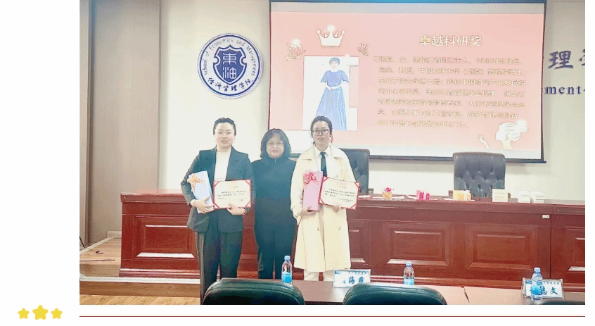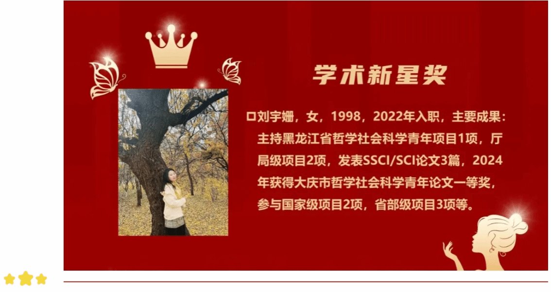 刘宇姗老师以女性独有的韧力为教育事业注入了新动力,如同一颗耀眼新星,为学术界注入新的力量与活力,获得“学术新兴奖”。