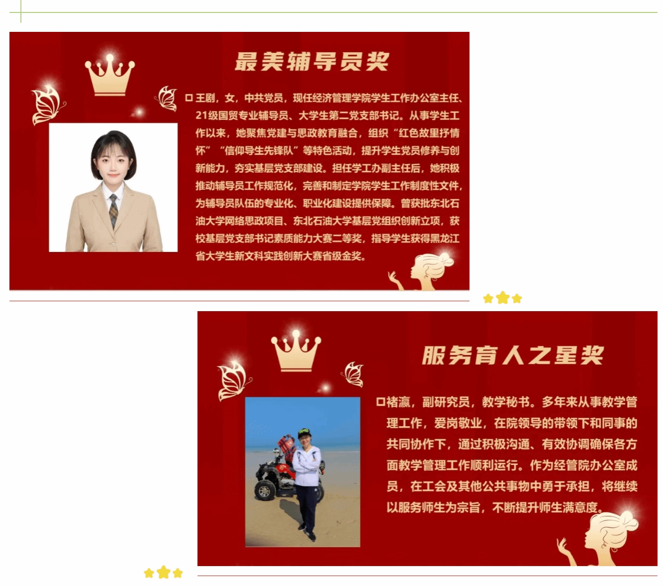 作为教辅工作人员,她们是员工心灵的守护者,用细腻的情感和无私的奉献,为员工排忧解难,帮助他们树立自信,克服困难,实现自我超越,王剧老师获得“最美辅导员奖”,褚瀛老师获得“服务育人之星奖”。