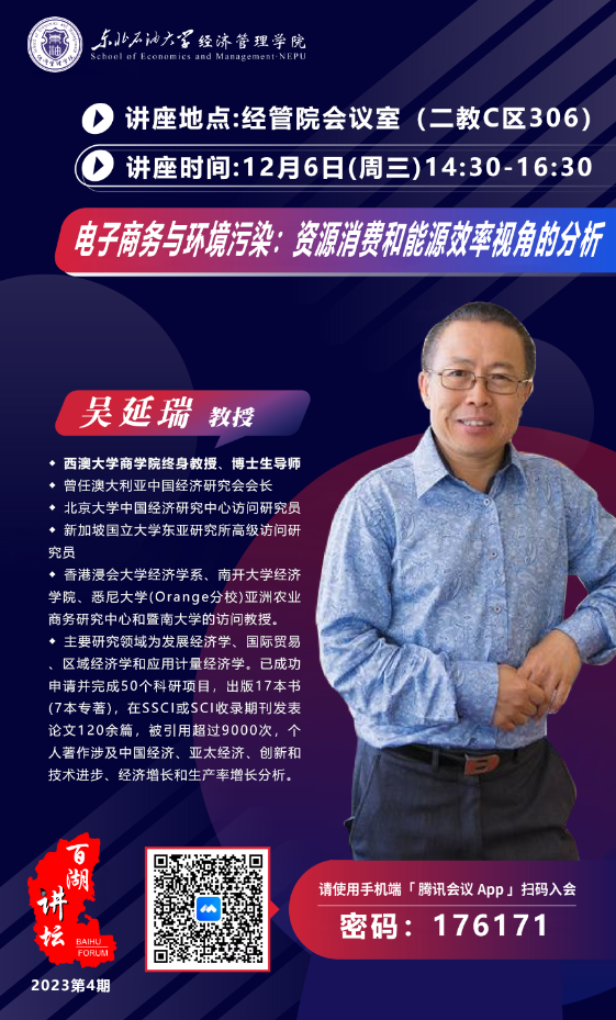 为营造浓厚的学术研究氛围,创新国际化人才培养路径,2023年12月6日14:30,unibet特别邀请西澳大学吴延瑞教授就“电子商务与环境污染:资源消费和能源效率视角的分析”开展学术报告。本次活动是unibet中文第六届国际学术交流周、百湖讲坛系列学术讲座之一,也作为推动公司国家基金申报的系列活动之一。参加此次会议的有公司师生及线上来自大庆师范公司、八一农垦大学、大庆社科联相关专家、教授和员工。报告由公司科研副经理张建华主持。