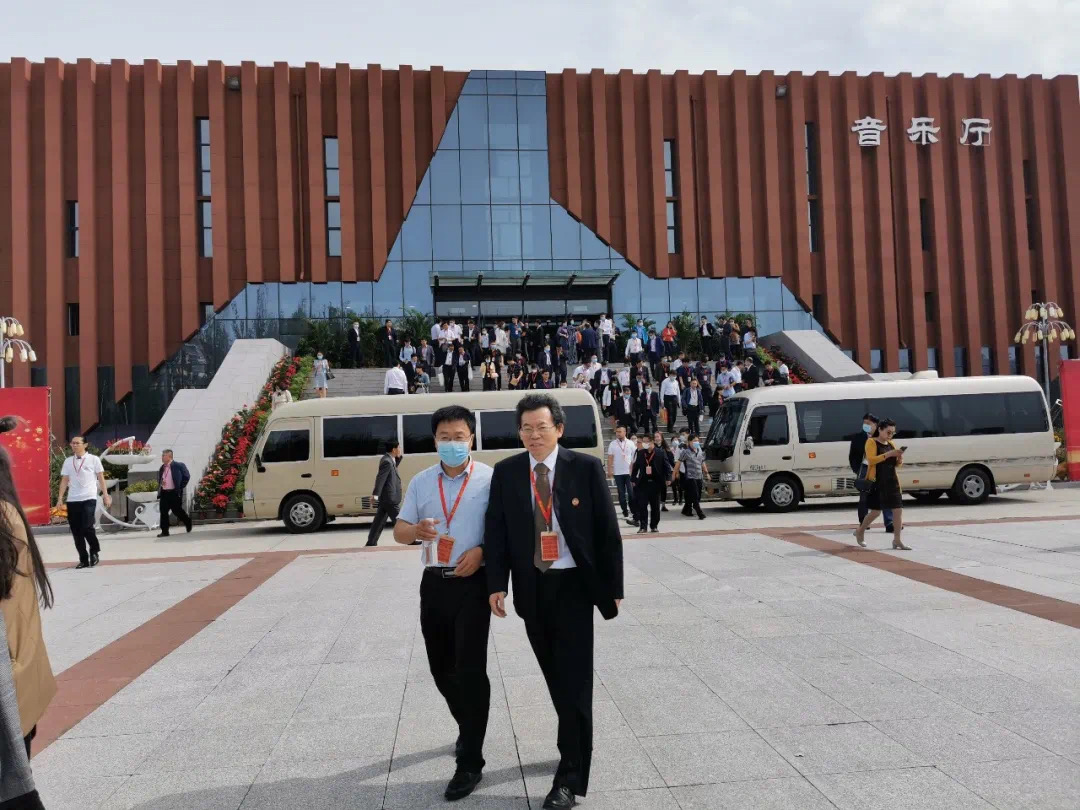 图 | 公司党委书记邵强、经理赵俊平与员工在音乐厅前合影
