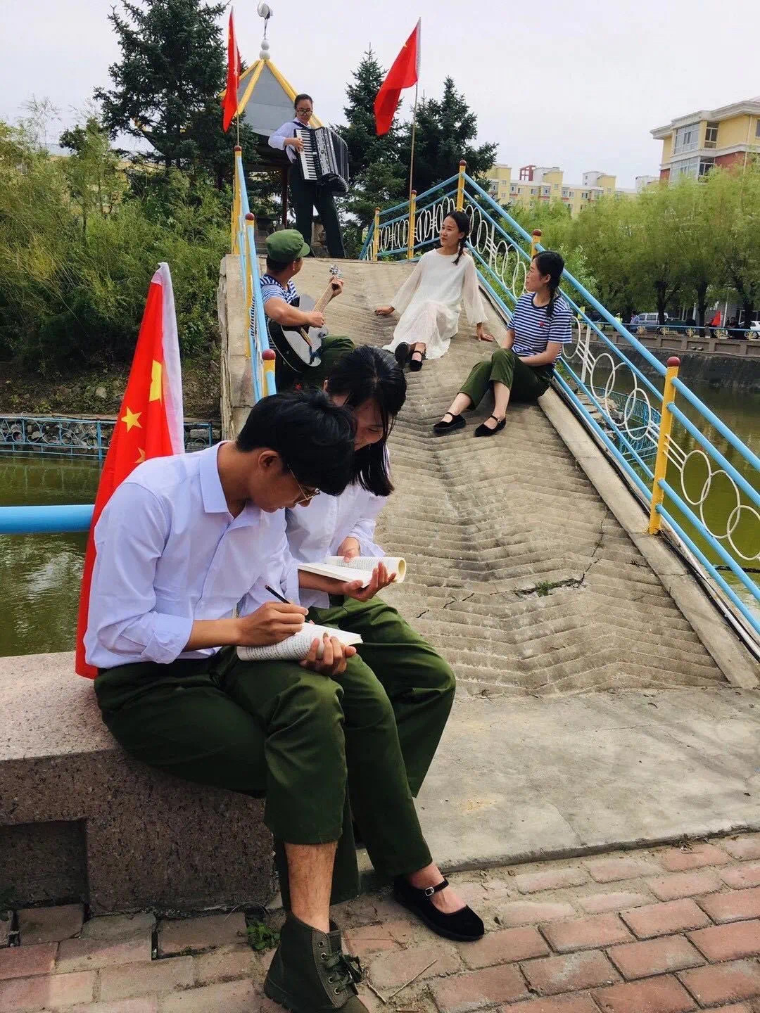 随后,各位经管员工及老师们再次乘坐大巴车前往小游园旧址。小游园曾是东油师生工作和学习之外的常到之处,承载了无数东油师生昔日在安达老校区生活的美好回忆。小游园旧址内的小桥上,几位群众演员复原了当时东油师生在小游园内读书、弹琴的场景,随着手风琴悠扬的琴声响起,员工和老师们的思绪便不禁重回到那个简单而快乐的纯真年代。