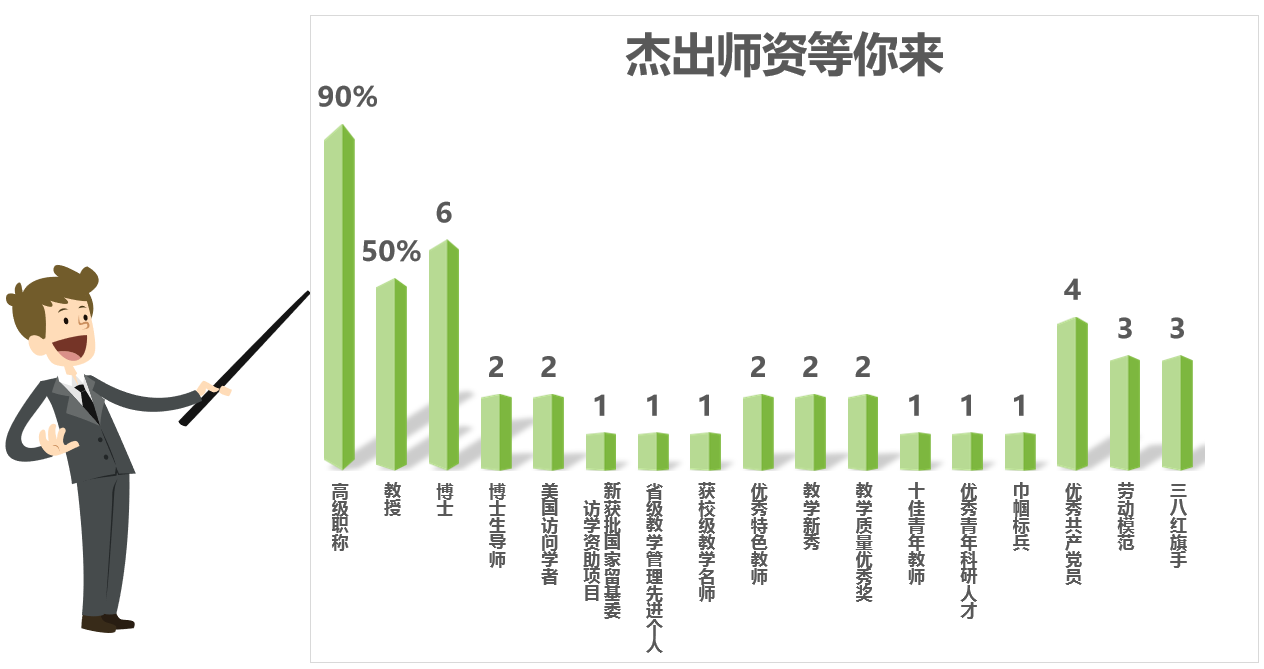 工程管理系团队力量强大,现有教授5人,副教授3人,博士生导师2人,硕士生导师8人,美国访问学者2人,具有博士学位的教师6人,在读博士1人。~是不是很亮眼!!!