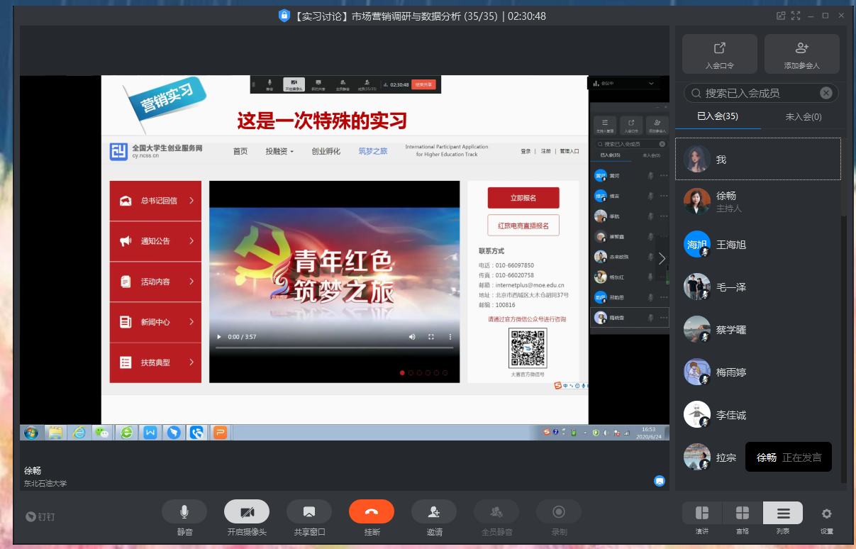 本着“践行‘红旅’精神,让课堂思政在营销云实习中大放异彩”的原则,市场营销专业将课程思政大幅融入到了本次的“云实习”当中。其中,实践课“市场营销调研与数据分析”便结合了“青年红色筑梦之旅”活动,以“调研+直播”的方式,充分利用互联网技术及平台助力高校“红旅”电商直播活动。此外,实践课“互联网+市场营销策划”在云策划方案中也代入了思政建设,将营销环节进一步细化、深化。课程思政的融入,使本次市场营销专业“云实习”比以往的实习实训更加新鲜、也更具有挑战性,也让市场营销专业的同学们在这一过程中实现了专业知识与人文情怀的双重提升。