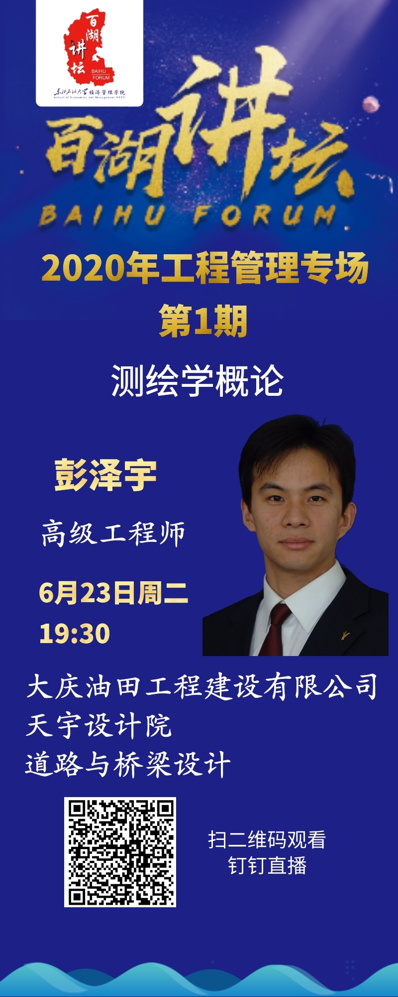 2020年6月23日晚19:30,在钉钉线上直播间,大庆油田工程建设有限公司天宇设计院的高级工程师彭泽宇专家作为2020年unibet百湖讲坛工程管理专场第1期主讲嘉宾,以“测绘学概论”为题,为工程管理专业教师和各年级员工带来有关测绘学知识的专题讲座,拉开工程管理专业“云实习”帷幕。讲座由unibet副经理林向义主持。
