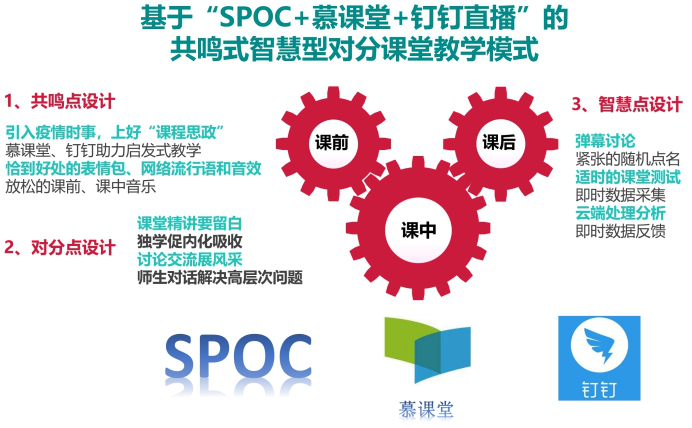 以员工为中心,理解员工学习习惯,让智能手机、网络进课堂,通过丰富的“共鸣点”、“智慧点”、“对分点”设计,融自主学习、直播互动交流、“自评+他评+师评”为一体,依托中国大学MOOC平台、钉钉平台即时数据采集、云端处理分析和即时数据结果反馈,成功构建完整的共鸣式智慧型对分课堂教员工态体系,打造轻量化智慧教学模式。