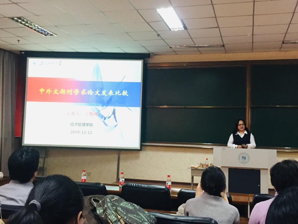 王艳秋教授从中外文期刊发表难度、发表周期、期刊内容结构和期刊投稿方式等四个方面进行中外期刊学术论文发表比较。通过对比分析,王老师认为论文发表选题方向是重点、期刊选择是关键、论文润色是保障。她鼓励教师和员工要改变思想认识,积极向SCI、SSCI等高级别期刊投稿。讲座的最后王老师说:“冰冻三尺非一日之寒,搞学术并非一件容易的事情,但我们要专心学术、坚持不懈,不要害怕失败,只要踏踏实实做学问,认认真真写文章,在发表文章的道路上一定会收获满满”。