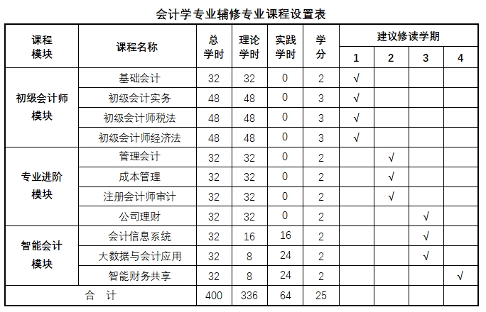 针对会计学辅修专业,课程精心设置初级会计师模块、专业进阶模块、智能会计模块三个模块。初级会计师模块精准聚焦全国初级会计团队格考试;专业进阶模块注重财会理论提高;智能模块紧跟时代智能大数据发展。